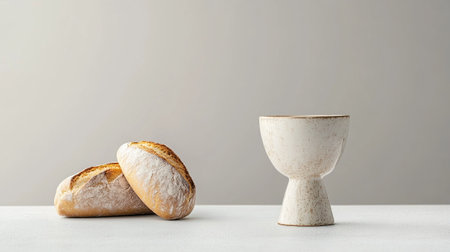 A realistic photo of a communion cup and bread, placed on a plain light gray background, with the left side open for text. --ar 16:9 --v 6.1 Job ID: b923b17d-3431-4d00-a3e3-a6cabed969c7