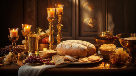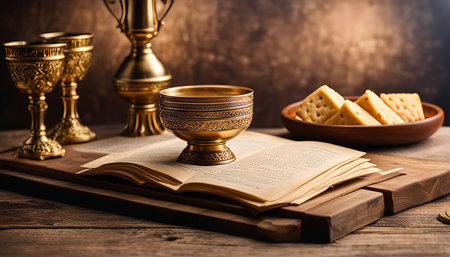 A still life image featuring a golden chalice, a book, and a plate of bread on a wooden table, depicting a religious ceremony or ritual with a vintage and elegant atmosphere.