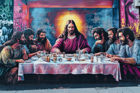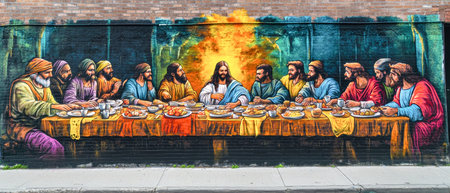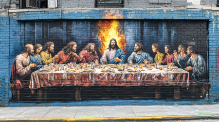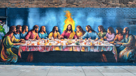 A striking graffiti mural captures the essence of the Last Supper, featuring Jesus and his disciples in vivid colors. The mural delights city dwellers and travelers alike.