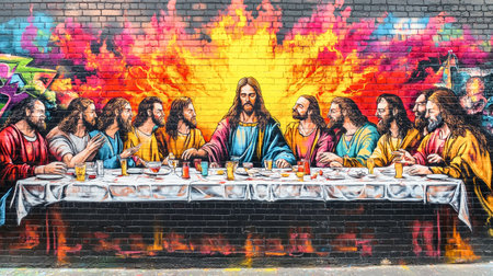Colorful graffiti transforms a city wall, depicting the Last Supper with Jesus and his disciples in street art style amidst fiery red and yellow flames.