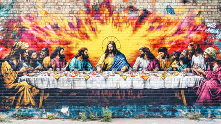 A stunning graffiti mural showcases the Last Supper with Jesus and his disciples, infused with bright colors, creating an eye-catching urban artwork in a bustling city.