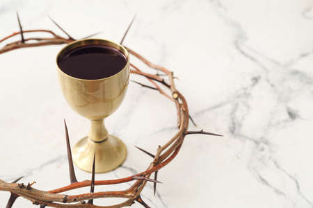 Chalice of wine and crown of thorns on white background