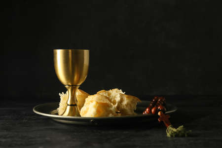 Tray with cup of wine, bread and rosary on dark background