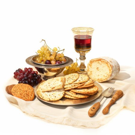 a table adorned with a variety of delicious food, arranged in a symbolic manner reminiscent of religious imagery. the white background enhances the photorealistic pastiche created by greg olsen. the color palette of light gold and maroon adds a touch of elegance to the composition. this associated press photo showcases a perfect blend of transparency and opacity, capturing the essence of a ready-to-enjoy meal. ai