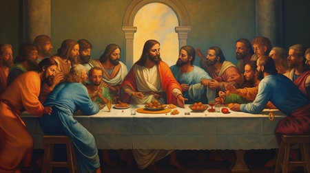 The Last Supper, capturing the profound moment of last supper with Jesus Christ and the 12 apostles in a stunning representation of biblical faith, history, and devotion. Bible god religion