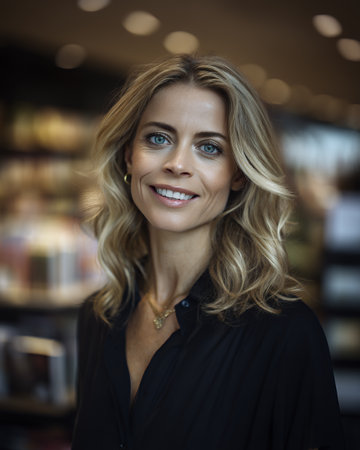 A woman with blonde hair and blue eyes smiles in a library. The setting shows shelves filled with books and soft lighting during daytime hours.