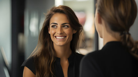 A cheerful woman with long hair displays a warm smile in a professional studio environment. Soft lighting enhances her natural beauty and confidence.
