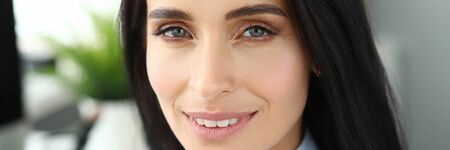 Portrait of a beautiful middle-aged European woman in a white classic blouse. Seductive brunette with beautiful eyes. Clean skin and a well-groomed face