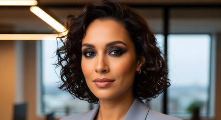 A close-up professional headshot of an elegant and confident woman with curly dark hair and dramatic smokey eye makeup. She is in a modern office environment, looking directly at the camera with a poised expression.