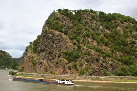 The legendary Loreley rock with the River Rhine (Rhein) and a container ship in Germany