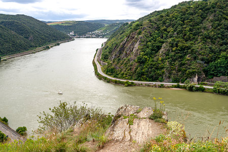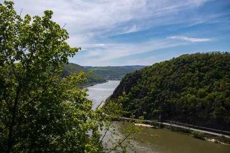 The view from above of the Loreley rocks the Rhine and the federal highway 42 near Sankt Goarhausen