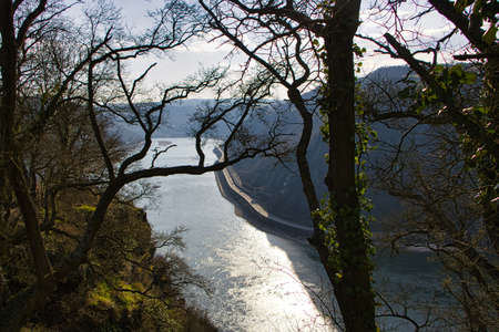 The river Rhine in western Germany flows between the hills covered with forest, visible river bend and rock cliff.