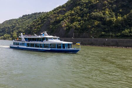 River Rhine, Germany - July 07, 2018: Pleasure boat with tourists on the River Rhine