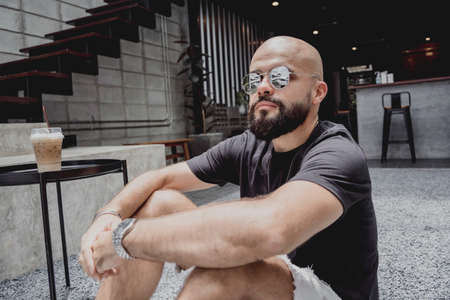 A young man in t-shirt and shorts at modern city cafe