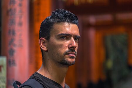 Kyoto - May 28, 2019: Western traveler in the Torii gates of the Fushimi Inari Shinto shrine in Kyoto, Japan