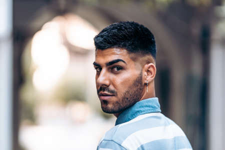 Young handsome man with short hair posing in an urban context