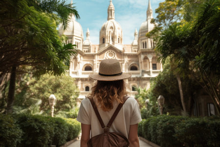 Rear view of a young woman wearing a straw hat and a white T-shirt is standing in front of the Notre Dame de Paris, France, Female tourist sightseeing at St Joseph Cathedral, rear view, AI Generated