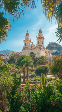 Experience the grandeur of La Virgen de Ãfrica Basilica with its intricate architecture, surrounded by vibrant gardens and the backdrop of a clear blue sky in Ceuta.