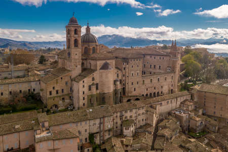 Aerial panorama of the Ducal Palace of Urbino medieval walled town and university in Marche, Italy a popular travel destination