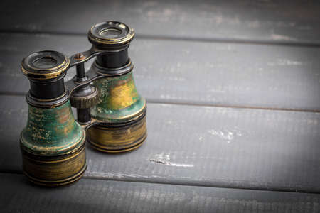 Old binoculars covered with patina on a gray woodenbackground.