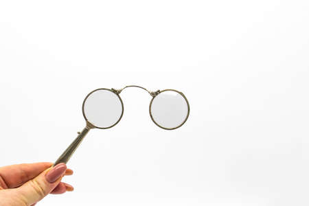 Hand hold an old vintage lorgnette from the middle of the nineteenth century on the white background