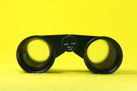 front of black retro binoculars from ussr in yellow background optic tools