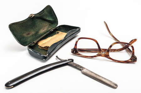 Old and worn rusty razor, glasses and glasses case on a white background
