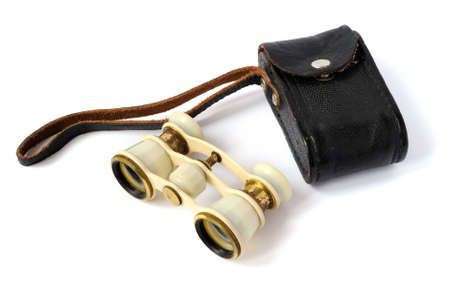 old opera glasses with a leather handbag on white background
