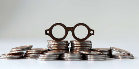 Miniature eyeglasses on a pile of coins. The concept of the importance of information analysis prior to successful investment.