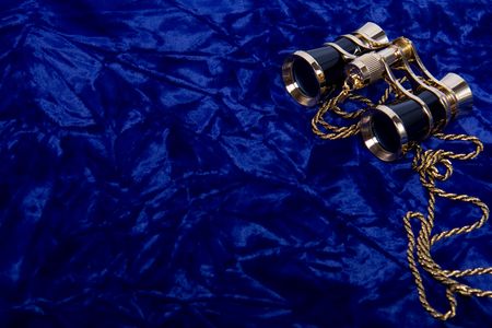 Theater concept. Opera glasses on blue velvet.