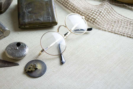 vintage, vintage accessories, old round glasses and old accessories on the table