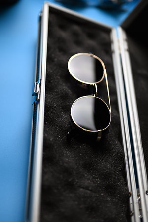 vintage sunglasses in case on blue table