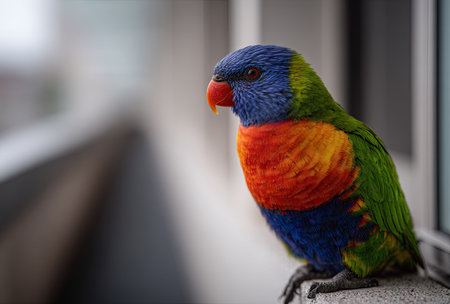 A close-up captures a brightly colored parrot, showcasing its vivid blue, green, orange, and red plumage. The bird perches on a ledge, likely near a window, with a blurred background suggesting an outdoor setting. The image displays natural lighting and could be used for various commercial or editorial applications.