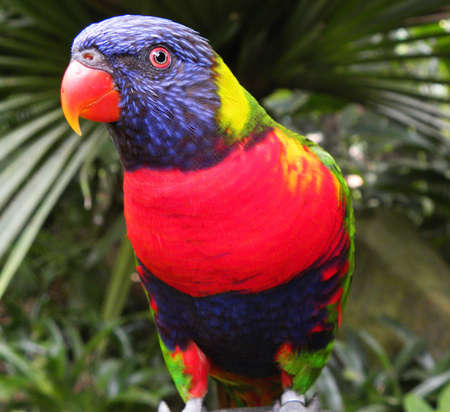 A colorful lorikeet from Australia, perched on a branch in a zoo.