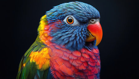 Close-up portrait of colorful lorikeet parrot, vibrant feathers against black background