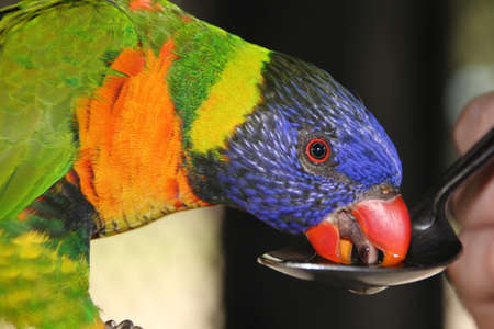 One Native Australian Rainbow Lorikeet drinks from feeding plate.