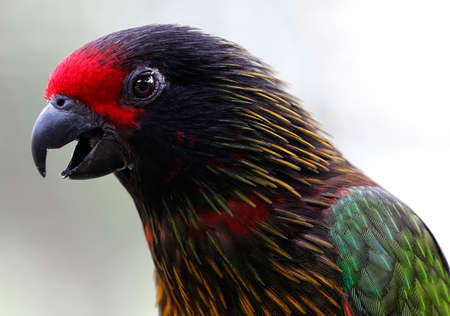 Purple-bellied Lory with Vibrant Red and Green colors looking happy. closeup photo