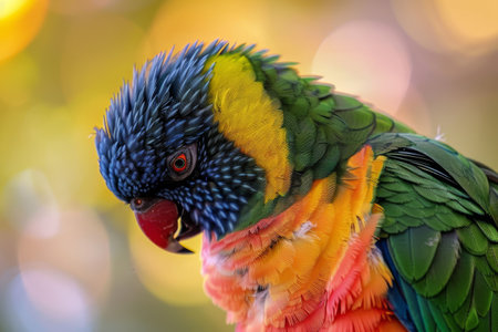 Portrait of a small colorful parrot sitting on a branch. Tropical bird, lory family. Red, blue, yellow and green colors. Close up view of the animal with a blur background. Multicolored feathers. avifauna, netherlands