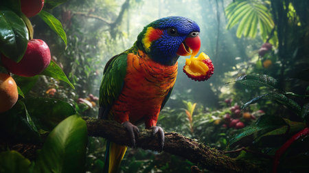 Colorful parrot enjoying food in a vibrant garden setting during daytime