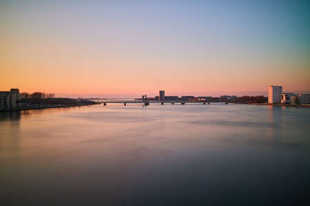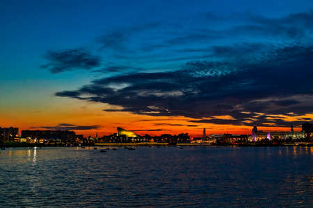 Gdynia, Poland - 09.23.2021: Sunrise in the port viewed from the deck of cruising ship. Blue Damen building.