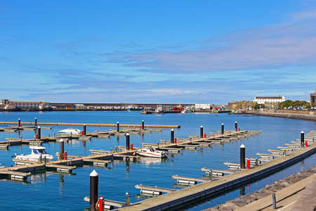 Ocean port and motorboat piers of Ponta Delgada, Azores, Portugal. Moored vessels and motorboats at port piers on a beautiful sunny morning.