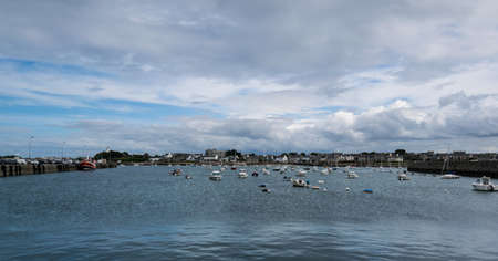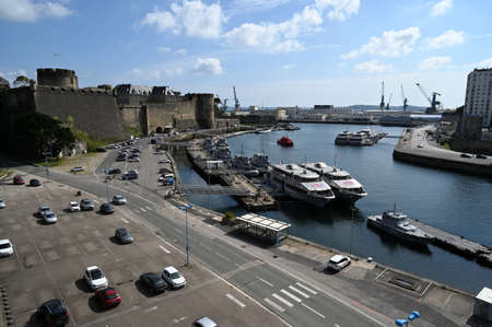 Concarneau, France - August 10, 2017: View of the De La Plaisance harbor with the ramparts of Ville Close in the background