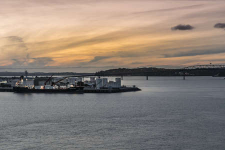 Auckland, New Zealand - March 6, 2017: Westhaven oil terminal with docked tanker at sunset. Orange sky, Silver water. Auckland Harbour Bridge in photo.