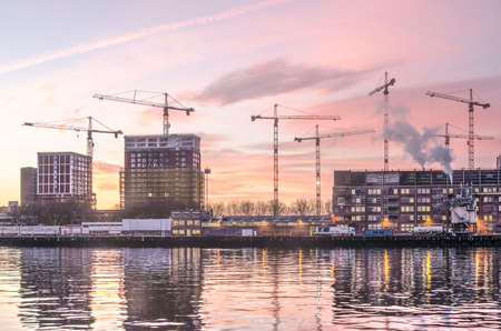 Rotterdam, The Netherlands, January 18, 2019: Seven construction cranes at Katendrecht under a spectacular pink sky at sunrise