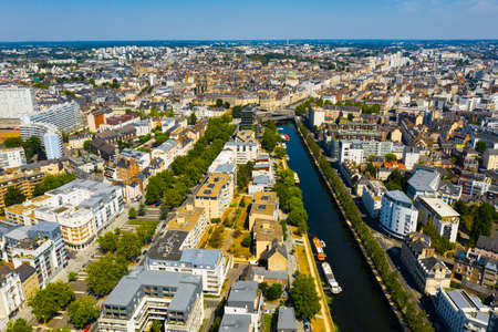 CAEN, FRANCE-SEPTEMBER 2021: Viaduc de Calix on the canal de caen. The largest bridge in Caen, an important road for cars. A photo from the drone, in the phone is buildings and greenery