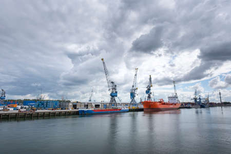 Panoramic view of the commercial harbour of Stralsund with cranes at sunrise against the bridge to the island of Rugen