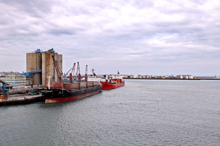 Cargo terminal for loading bulk cargo of cooper concentrates by shore cranes. View of piers and vessels under loading operation. Vancouver, WA, USA. August, 2020.
