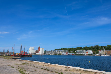 View of the harbor in Flensburg, Germany, featuring ships, industrial buildings, and modern architecture against a clear blue sky on a sunny summer day