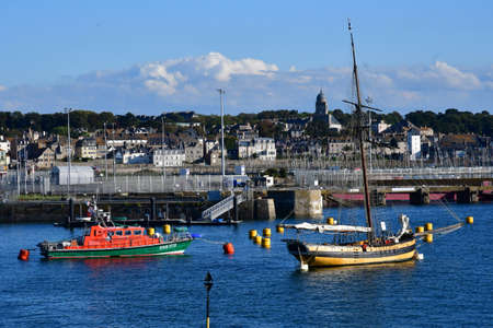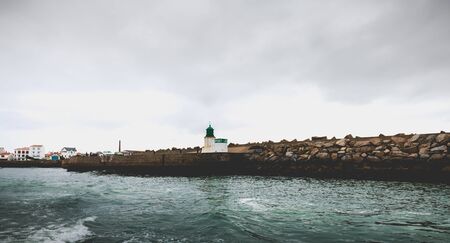 Port Joinville on the island of Yeu - September 18, 2018: entrance to the port of the island of Yeu with its semaphore and typical small houses on a fall day