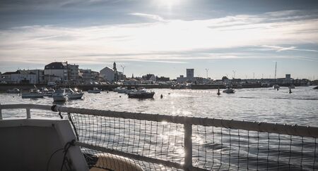 Saint Gilles Croix de Vie, France - September 16, 2018: rear view of a ferry leaving the port towards the island of Yeu on a summer day